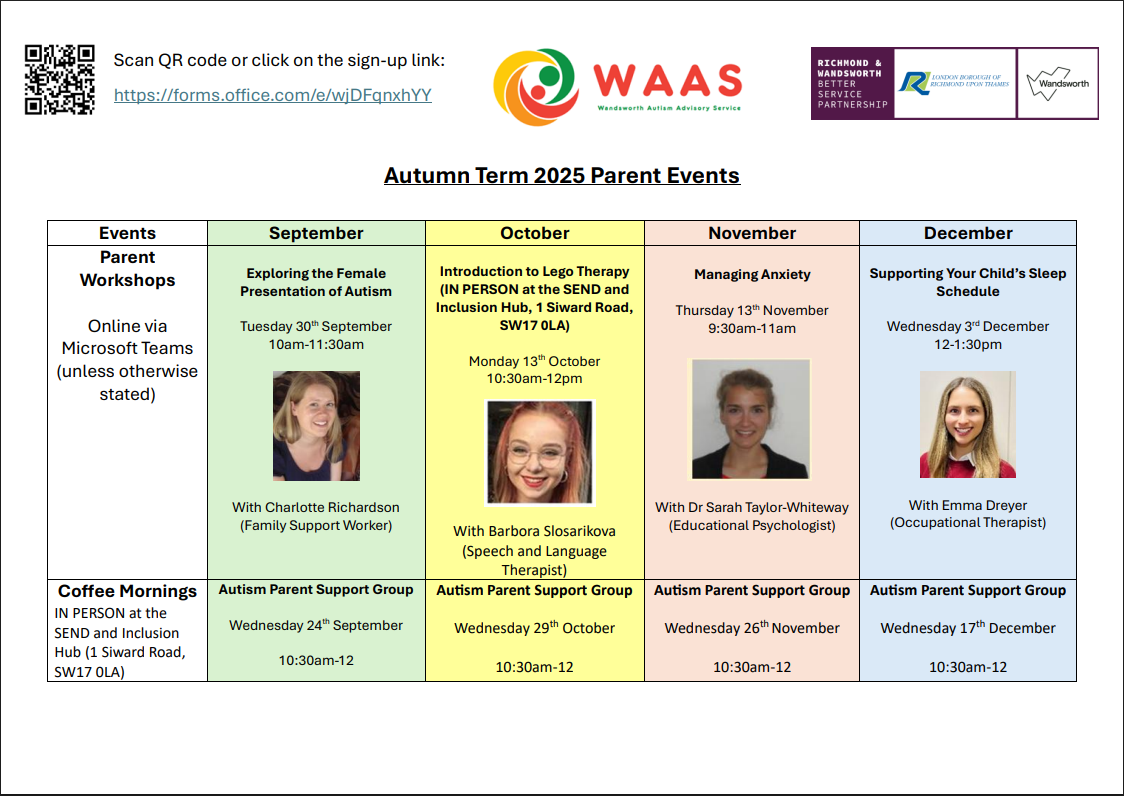 Please see below for Autumn Term 2025 Parent Events hosted by Wandsworth Autism Advisory Service (WAAS)